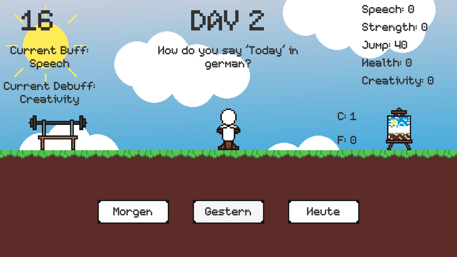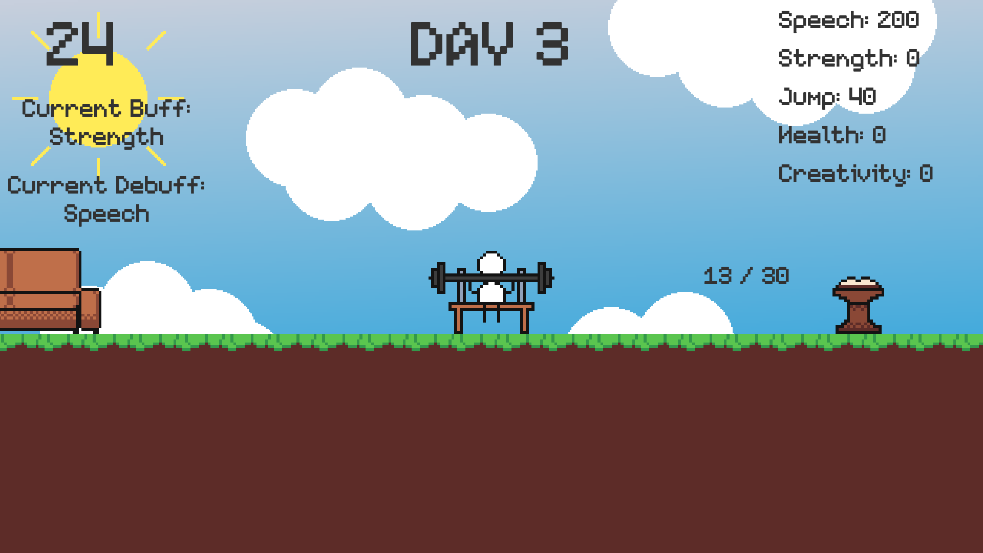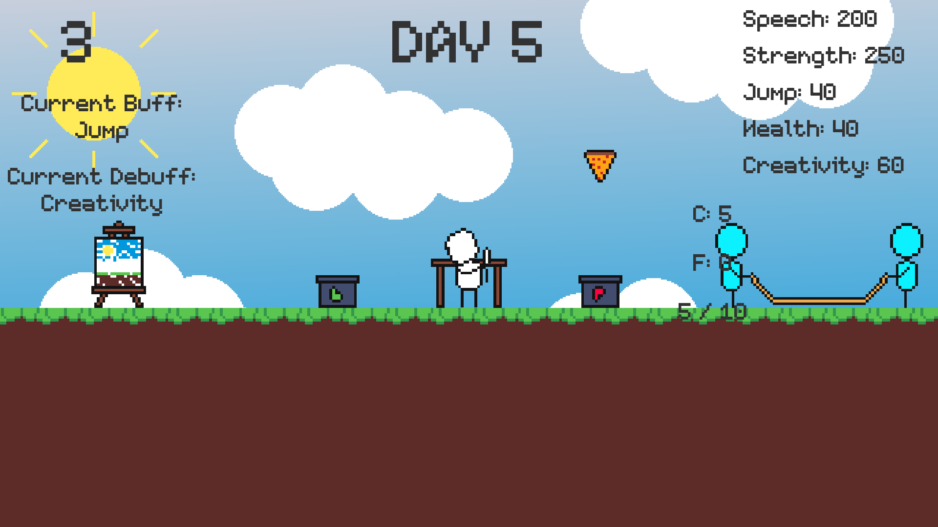 You have 5 days to accomplish your goal. Each day, a random buff and a random debuff are rolled. The minigame with the buff, gives 2x the points, while the minigame with the debuff, gives minus points. The goal is to collect as many points in each stat as possible and to unlock the 8 different endings.